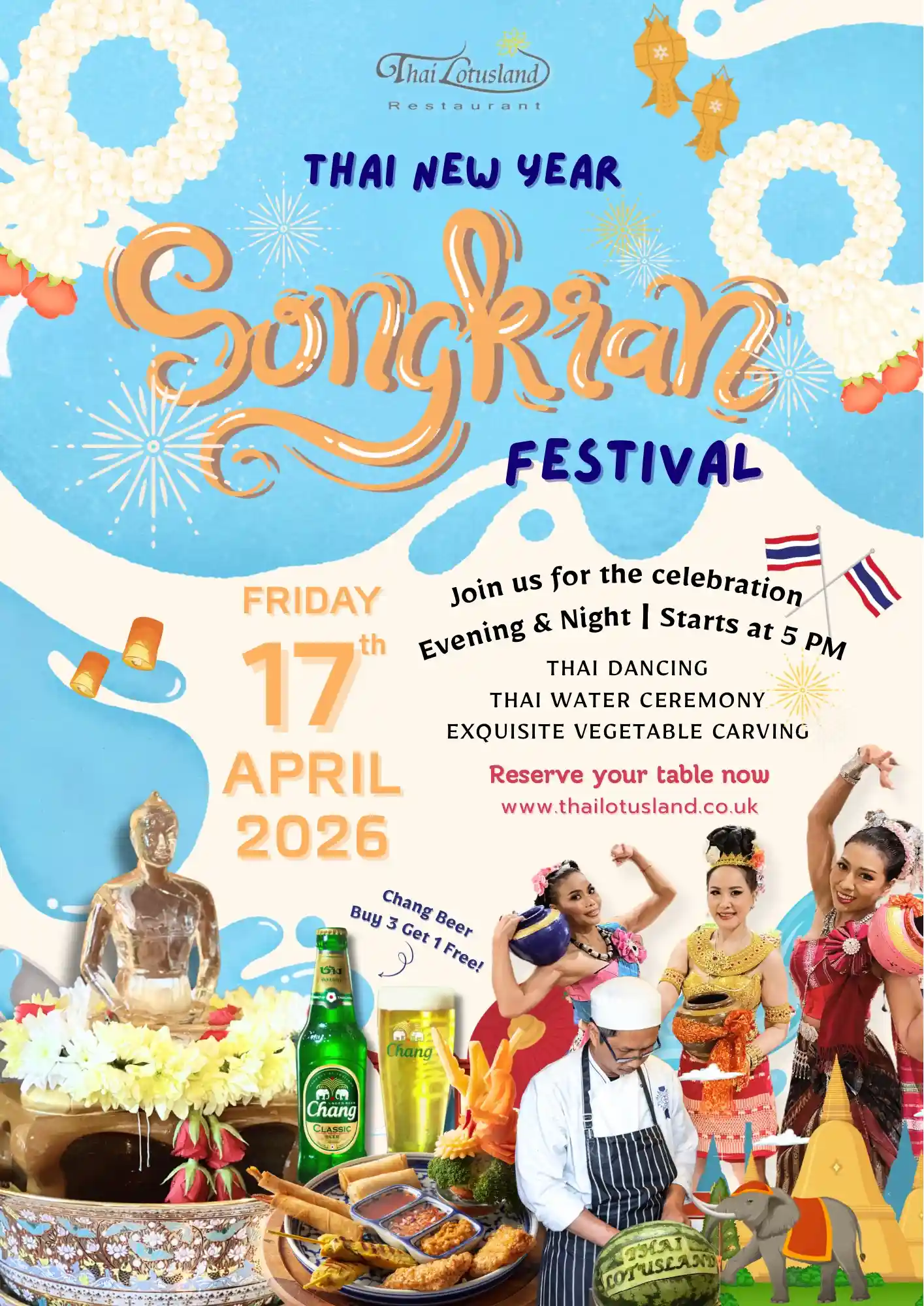 Looking for a unique night out? Celebrate the Songkran Festival with authentic Thai food, live performances, and an atmosphere like no other at Thai Lotusland Restaurant.